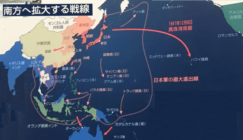 ◆◇南方作戦、大東亜共栄圏の拡大 こうして「食料も資源も」全てを大陸頼みの日本は、世界から批難を浴び、アメリカから石油禁輸制裁が課せられると、それを東南アジアに求め「南方作戦」を開始した。 それは 【大東亜共栄圏(アジア諸国が共に栄える)】を唱え、「列強植民地からの独立」を促して支持を集め、マレーシア、シンガポール、インドネシア、パプアニューギニア、フィリピン、マリアナ・・・や太平洋諸国の併合を開始した。 ◆◇太平洋戦争突入 しかもこれまでの戦場は全て大陸だった。 「戦争が如何に凄惨で、残酷か・・・」内地国民はどれだけ理解していただろう(?) 大本営発表の華々しい「連勝報道や・神国日本」に洗脳され、マスコミに先導され、憲兵に強要され、「鬼畜米英 !! 」を合い言葉に・・・ "敵愾心" に燃え上っていた。 |